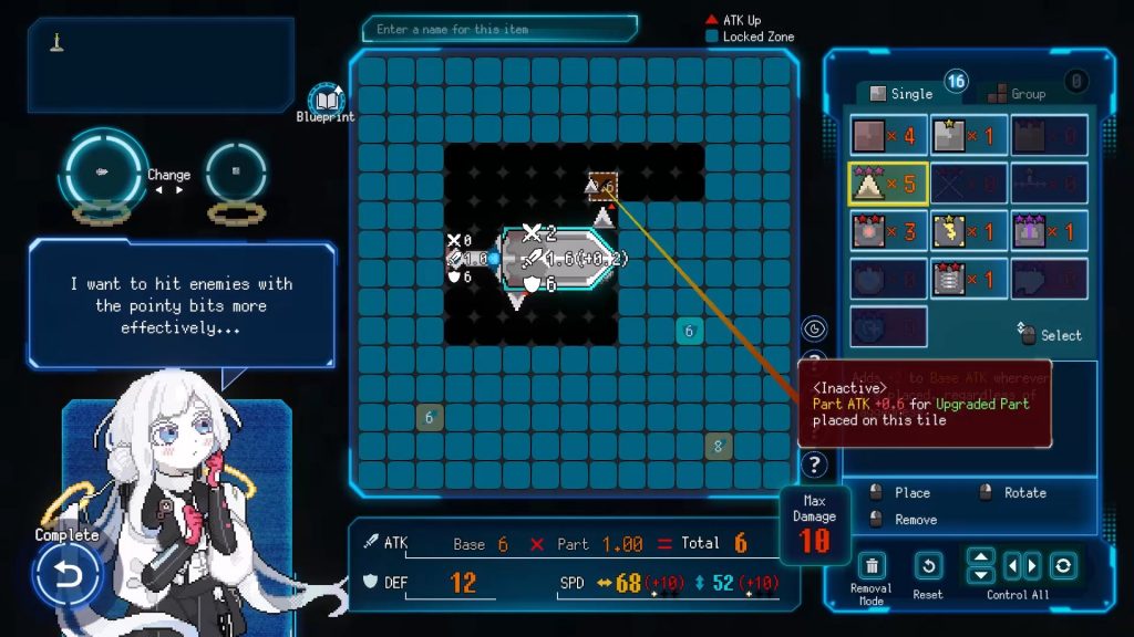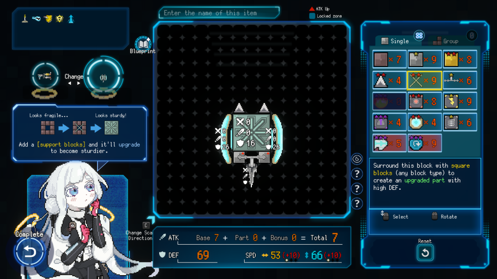 Weapon crafting has also been enhanced, and new status up tiles will now appear randomly on your pallet. These tiles grant different buffs to whatever block is placed on it, so each playthrough will have different optimal weapon builds, offering an even more in-depth crafting system. Status up tiles have also been added to the demo, so you can try them out there too!