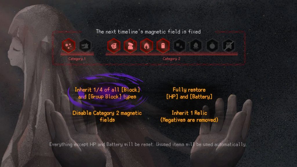 Achievements for the α route, playable in the demo, will only be unlocked upon playing the route again in the full version. Moreover, while relics and blocks you unlocked with karma in the demo can be carried over and used in the full game as well, they will be shown as locked on the collection screen. They will be shown as unlocked upon obtaining the items again.